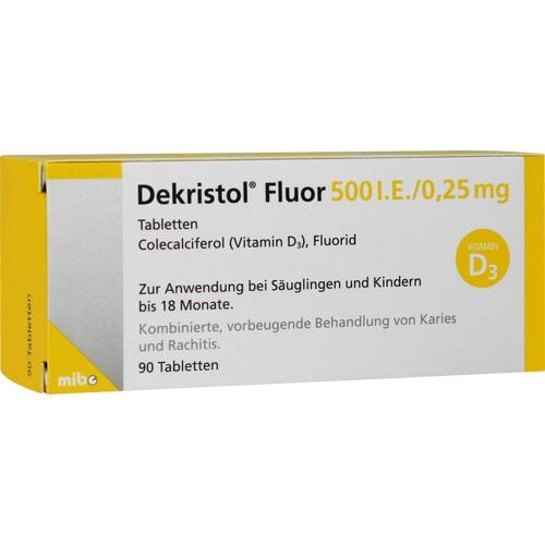 DEKRISTOL Fluor 500 I.E./0,25 mg Tabletten ist zur Prophylaxe von Rachitis und Karies bei Säuglingen und Kleinkindern bis zu einem Alter von 18 Monaten, wenn die Fluoridkonzentration im Trink-/Mineralwasser unter 0,3mg/l liegt und kein weiteres Fluorid eingenommen wird (z.B. Verwendung von fluoridhaltiger Zahnpasta, Fluoridsalz, Fluoridtabletten).