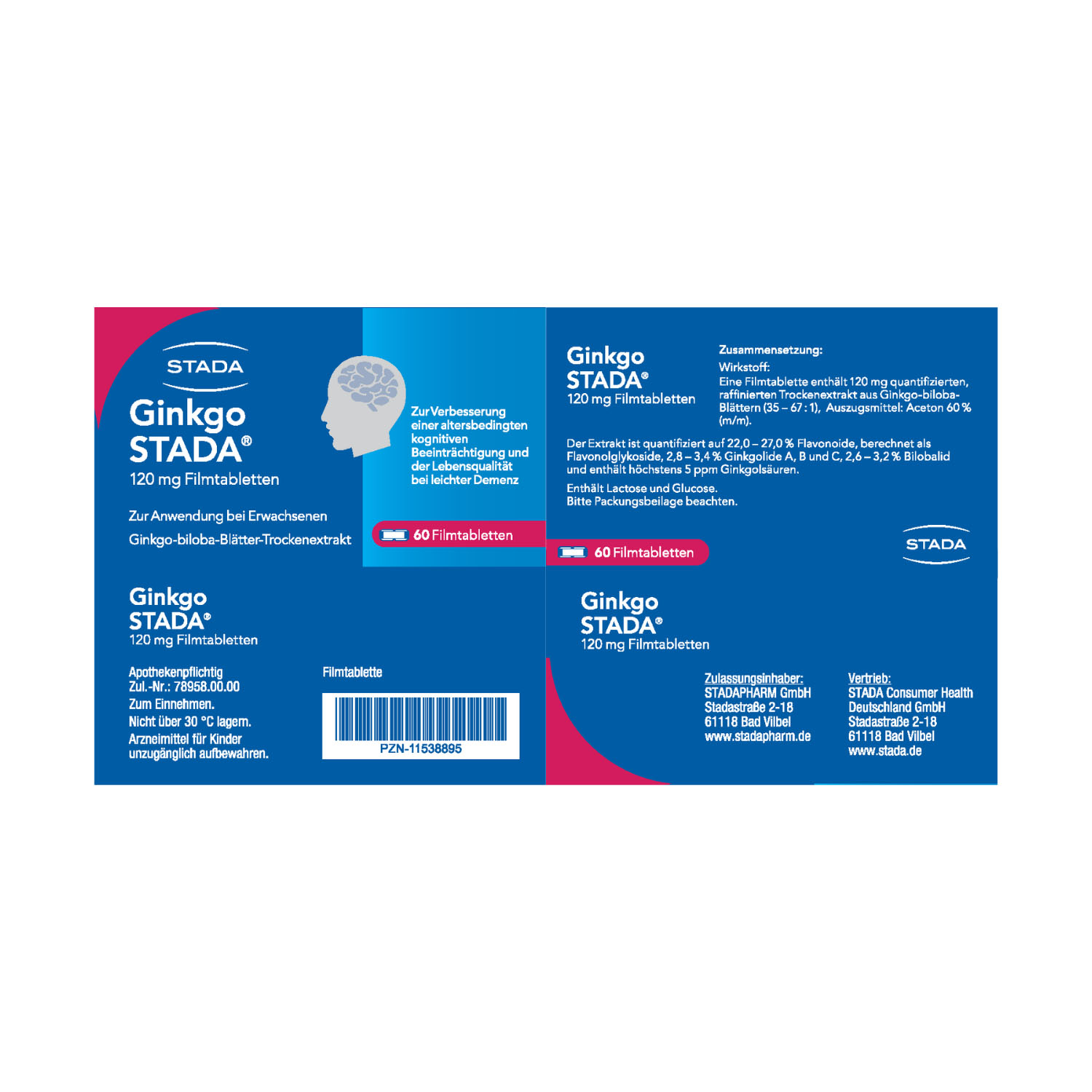 Anwendungsgebiete: Ginkgo STADA® ist ein pflanzliches Arzneimittel zur Verbesserung einer altersbedingten kognitiven Beeinträchtigung und der Lebensqualität bei leichter Demenz. Enthält Lactose und Glucose.