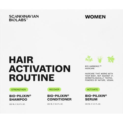 Das Hair Growth Routine Set für Frauen von Scandinavian Biolabs kombiniert drei aufeinander abgestimmte Produkte für eine ganzheitliche Pflege bei Haarausfall – bestehend aus Shampoo, Conditioner und dem klinisch getesteten Bio-Pilixin® Serum.