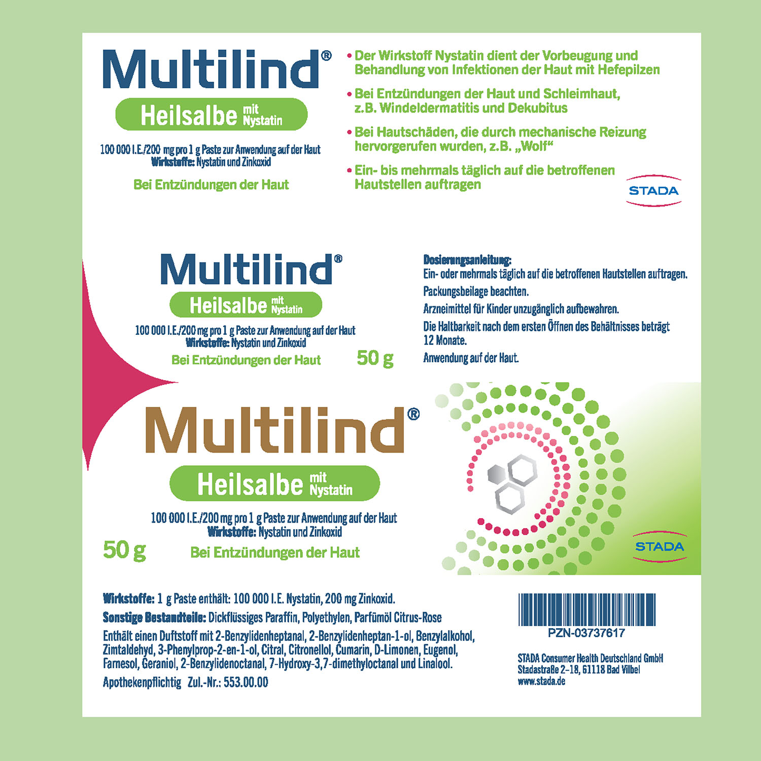 Ob bei Windeldermatitis, für Sportler die sich einen Wolf gelaufen haben oder bei roten, juckenden Stellen oder Hautschädigungen durch Druckbelastung, beim Stillen oder durch mechanische Reibung: Die bewährte Multilind Heilsalbe hilft wunder Haut mit einer hochwirksamen Kombination aus Zinkoxid und Nystatin. Ist die Haut an einigen Stellen beschädigt, haben Bakterien und Pilze leichtes Spiel- Sie können in kleine Wunden eindringen und die Entzündung durch eine Hefepilzinfektion verschlimmern. Oft entsteht dann ein nässender und juckender Ausschlag. Multilind lindert den Juckreiz, hemmt die Entzündung, fördert die Heilung und lässt sich dank der Spezial-Salbengrundlage mit Softformel sanft und schmerzlos auftragen.