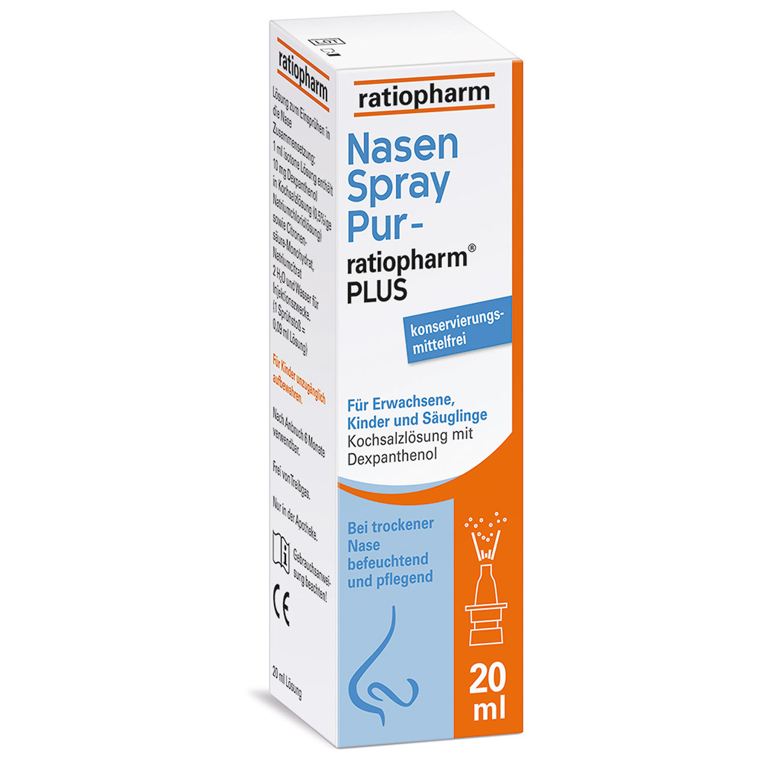 ist es wichtig, die Nasenschleimhaut intakt zu halten und vor dem Austrocknen zu schützen. Ideal sind dabei isotone Salzlösungen, die sich an die Salzkonzentration der Körperflüssigkeiten und Schleimhautzellen anpassen. NasenSpray PUR-ratiopharm® PLUS befeuchtet die Nasenschleimhaut mit einer Natriumchloridlösung und enthält zudem pflegendes Dexpanthenol, das als ideales Feuchthaltemittel die Feuchtigkeit auf der Nasenschleimhaut bindet und die natürlichen Heilungsprozesse angegriffener Schleimhautzellen sanft unterstützt. Aufgrund dieser Eigenschaften ist Dexpanthenol ein seit Jahren bewährter Wirkstoff zur Behandlung von oberflächlichen Wunden der Haut und Schleimhäute.