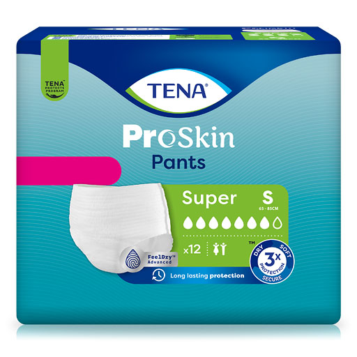 TENA® ProSkin Pants Super sind für Männer und Frauen geeignet und in verschiedenen Größen erhältlich. Größe S ist passend für einen Hüftumfang von 65 bis 85 cm.
