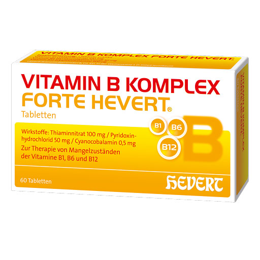 Vitamin B Komplex forte Hevert enthält Vitamin B1 (Thiamin), Vitamin B6 (Pyridoxin) und Vitamin B12 (Cyanocobalamin), die gemeinsam Stoffwechselprozesse in den Zellen, besonders in den Nervenzellen, ermöglichen und so zur Regeneration des Körpers und einer leistungsfähigen Vitalität beitragen. Bereits 1 Tablette Vitamin B Komplex wirkt zuverlässig bei Vitamin B1-, B6- und B12-Mangelzuständen und ihren Folgeerscheinungen.